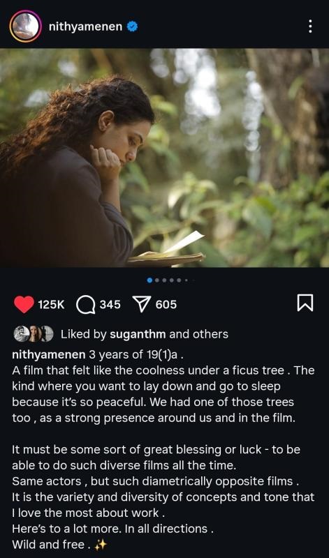 Actress Nithya Menen took to her social media to share her reflections on the third anniversary of her critically acclaimed film 19(1)(a). In her own words: