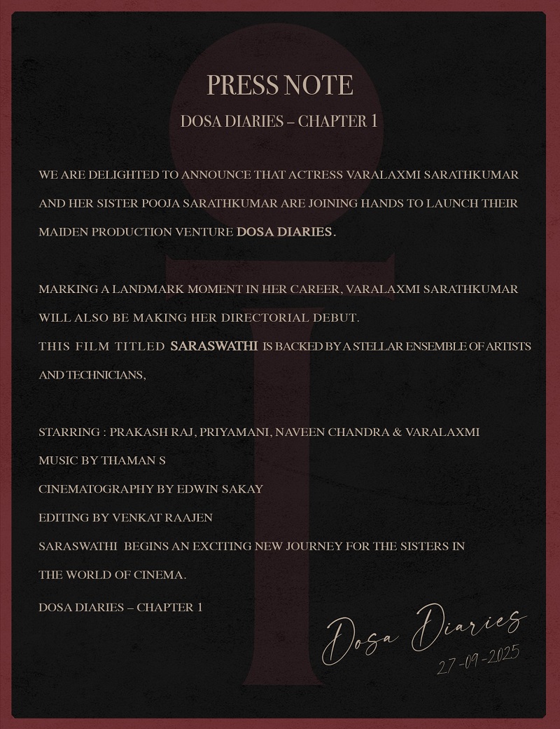 நடிகை வரலட்சுமி சரத்குமார் மற்றும் அவரது சகோதரி பூஜா சரத்குமார் இணைந்து தோசா டைரீஸ் என்ற புதிய தயாரிப்பு நிறுவனம் மூலம் தங்கள் முதலாவது தயாரிப்பை தொடங்கியிருப்பதை, மகிழ்ச்சியுடன் அறிவித்துள்ளனர்.