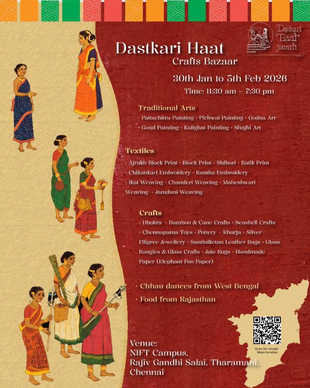 After nearly ten years, one of India’s most respected craft platforms returns to Chennai. Dastkari Haat Crafts Bazaar, curated by Dastkari Haat Samiti, re-emerges in the city with a week-long celebration of India’s living craft traditions, from 30th January to 5th February 2026, at the NIFT Campus, Rajiv Gandhi Salai, Tharamani.