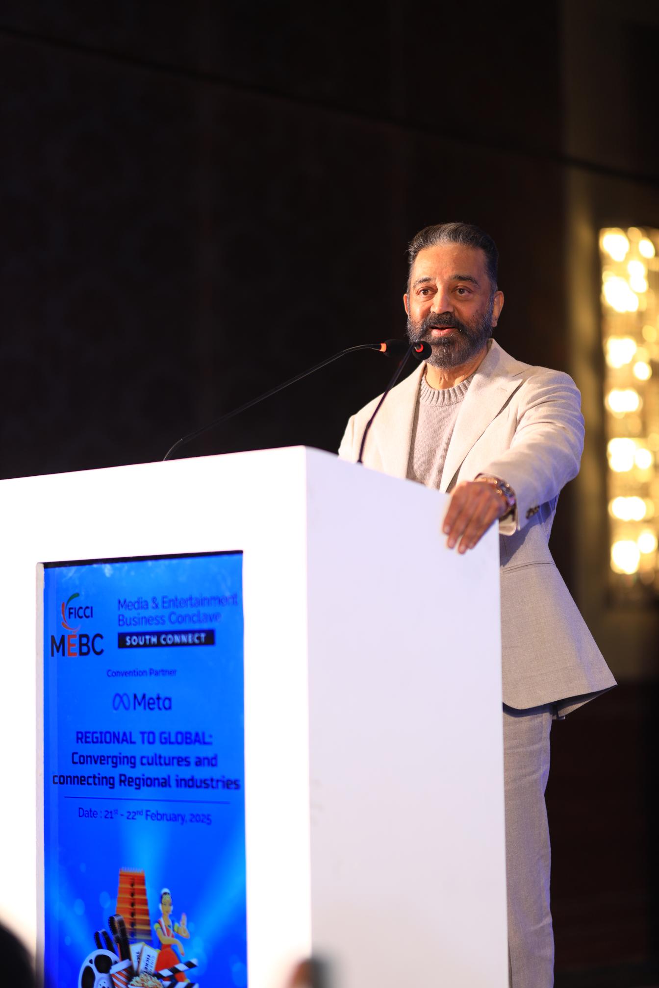 திரு கமல்ஹாசன் பேசுகையில், “இந்திய சினிமா நமது கலாச்சாரத்தின் உண்மையான தூதராக திகழ முடியும். இந்திய சினிமாவின் வளர்ச்சிக்கு ஒரு நீண்டகால தொலைநோக்கு திட்டம் நமக்கு தேவை. இதற்காக மத்திய மற்றும் மாநில அரசுகள் வளர்ந்து வரும் தொழில்நுட்பங்களைக் கட்டுப்படுத்தாமல் சந்தை வளர்ச்சியை ஊக்குவிக்கும் வகையில் வளர்ந்து வரும் தொழில்நுட்பங்களை உள்ளடக்கிய விதிமுறைகளை உருவாக்க வேண்டும்,” என்று கூறினார்.