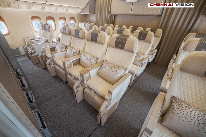 Emirates’ Boeing 777 Business Class cabin has also been redesigned, with seats arranged in a 1-2-1 configuration to offer privacy, full aisle access, and ample space to work, lounge, and rest. Each seat is wrapped in champagne leather, matching the ones on the latest Emirates A380, with detailed stitching and soft, cushioned headrests.