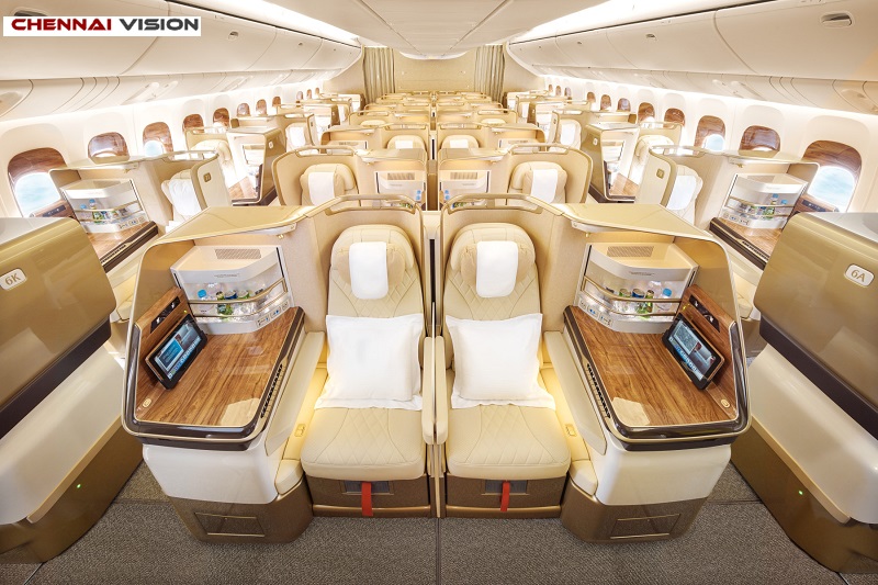 Emirates’ Boeing 777 Business Class cabin has also been redesigned, with seats arranged in a 1-2-1 configuration to offer privacy, full aisle access, and ample space to work, lounge, and rest. Each seat is wrapped in champagne leather, matching the ones on the latest Emirates A380, with detailed stitching and soft, cushioned headrests.