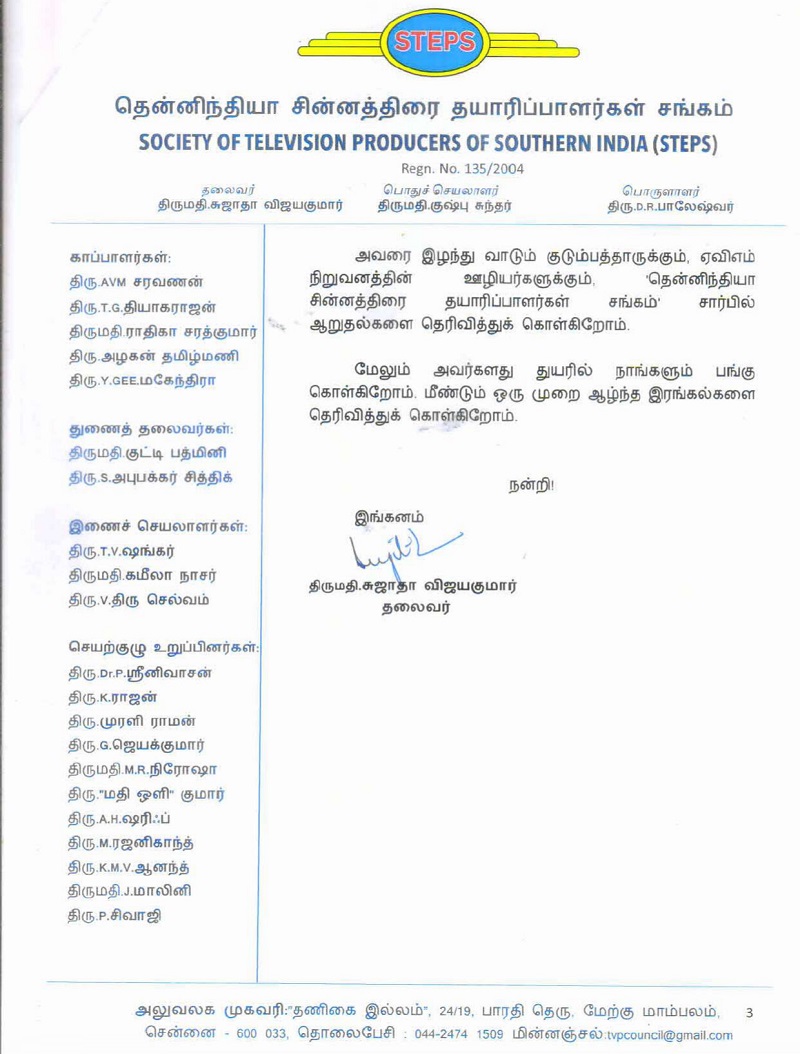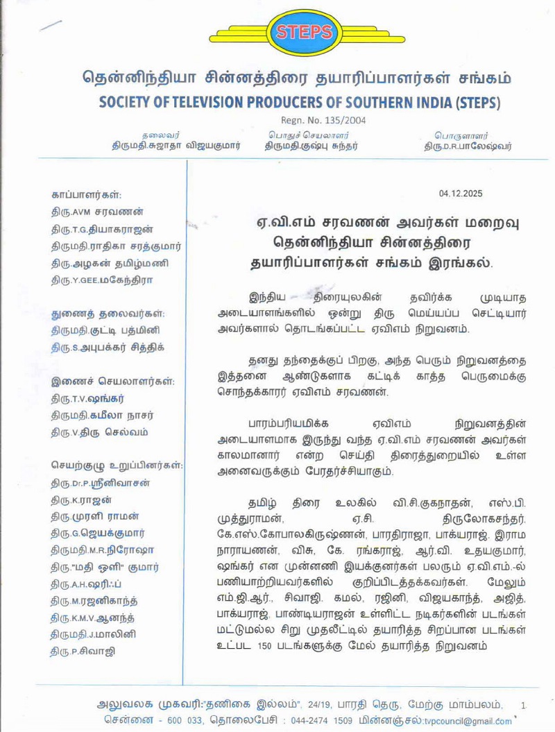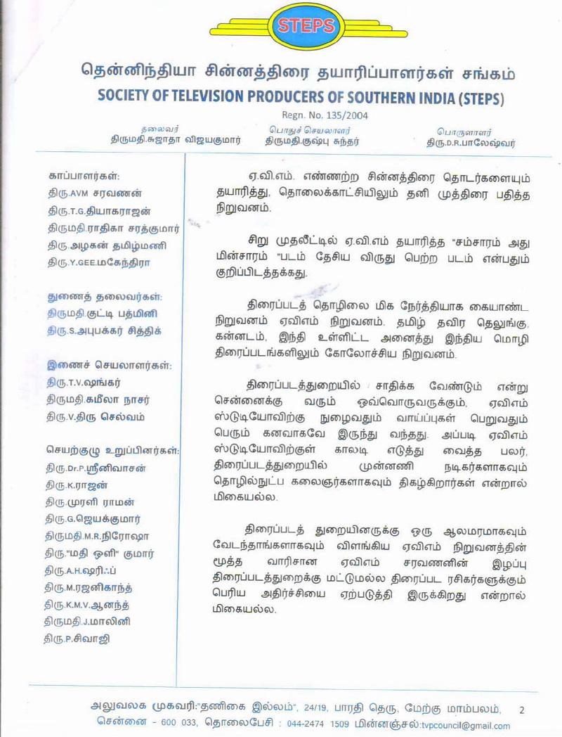 From the Office of the Society of Television Producers of Southern India (STEPS) By Chennaivision in General, News December 14, 2025 avm letter scanShare this: Click to share on X (Opens in new window) X Click to share on Facebook (Opens in new window) Facebook Like this:Like Loading...Related