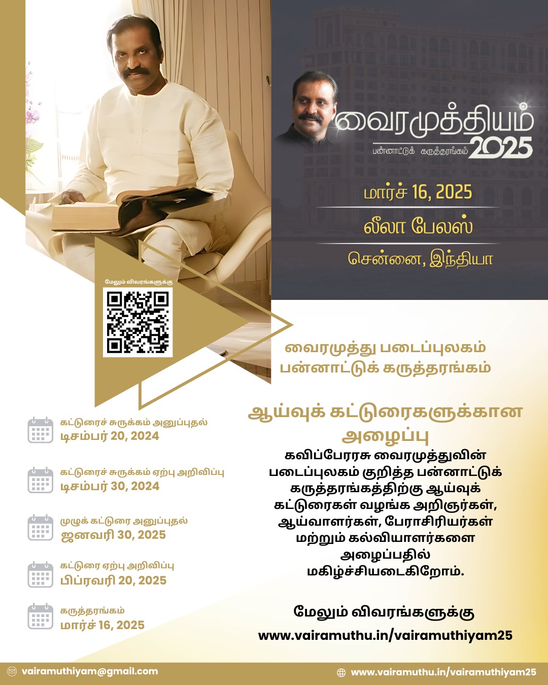 கவிப்பேரரசு வைரமுத்து படைப்புகள் குறித்த பன்னாட்டுக் கருத்தரங்கம் அடுத்த ஆண்டு மார்ச் மாதம் சென்னையில் நடைபெறுகிறது. உலகெங்கிலுமிருந்தும் பல்கலைக்கழகப் பேராசிரியர்களும், ஆராய்ச்சி அறிஞர்களும் கலந்துகொண்டு கட்டுரை வாசிக்கிறார்கள். கருத்தரங்கம் முழுநாள் நிகழவிருக்கிறது. மாலையில் நிகழும் நிறைவு விழாவில் முதலமைச்சர் மு.க.ஸ்டாலின் கலந்துகொள்ள வேண்டும் என்று கவிப்பேரரசு வைரமுத்து நேரில் சென்று அழைப்பு விடுத்தார்.