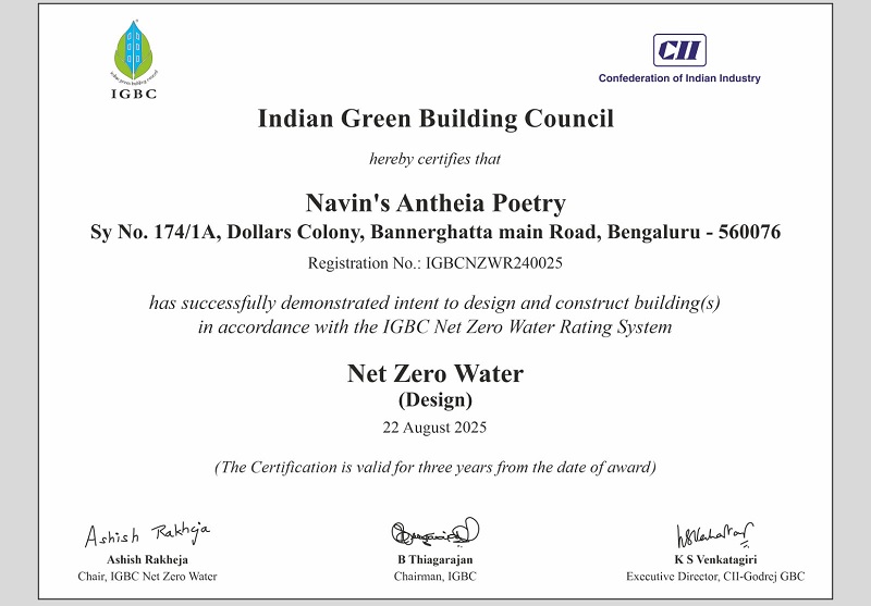 “We are honored and elated to receive the IGBC Net Zero Water (Design) Certification, which reinforces our commitment to building a greener future. As we bring our legacy of trust and innovation to Bengaluru through Navin’s Antheia Poetry, this recognition further strengthens our confidence to deliver communities that balance sustainability with modern living. At Navin’s, we remain dedicated to creating holistic environments where greenery and luxury coexist seamlessly.”