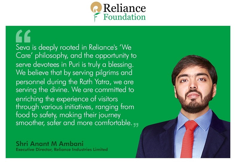 “Seva is deeply rooted in Reliance’s ‘We Care’ philosophy, and the opportunity to serve devotees in Puri is truly a blessing. We believe that by serving pilgrims and personnel during the Rath Yatra, we are serving the divine. We are committed to enriching the experience of visitors through various initiatives, ranging from food to safety, making their journey smoother, safer and more comfortable,” said Shri Anant M Ambani, Executive Director, Reliance Industries Limited.