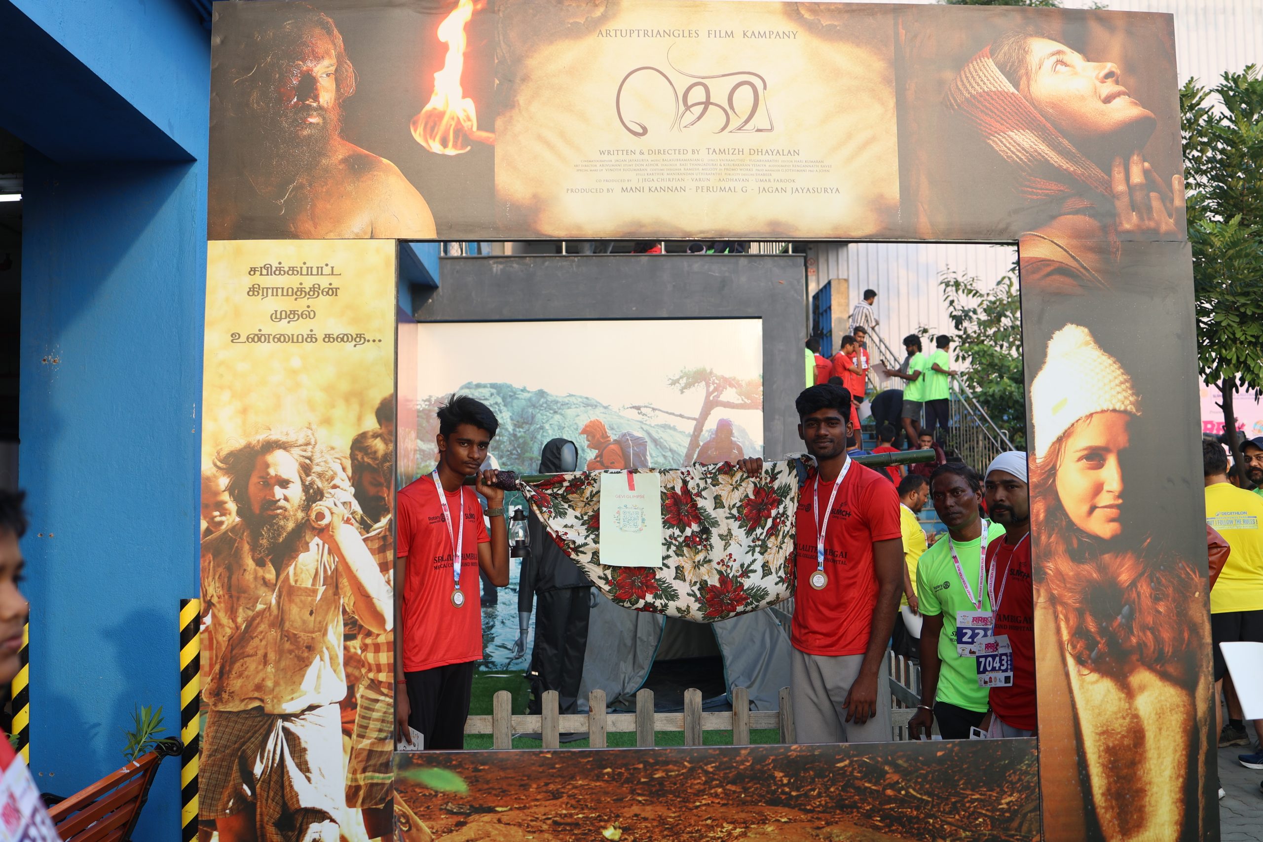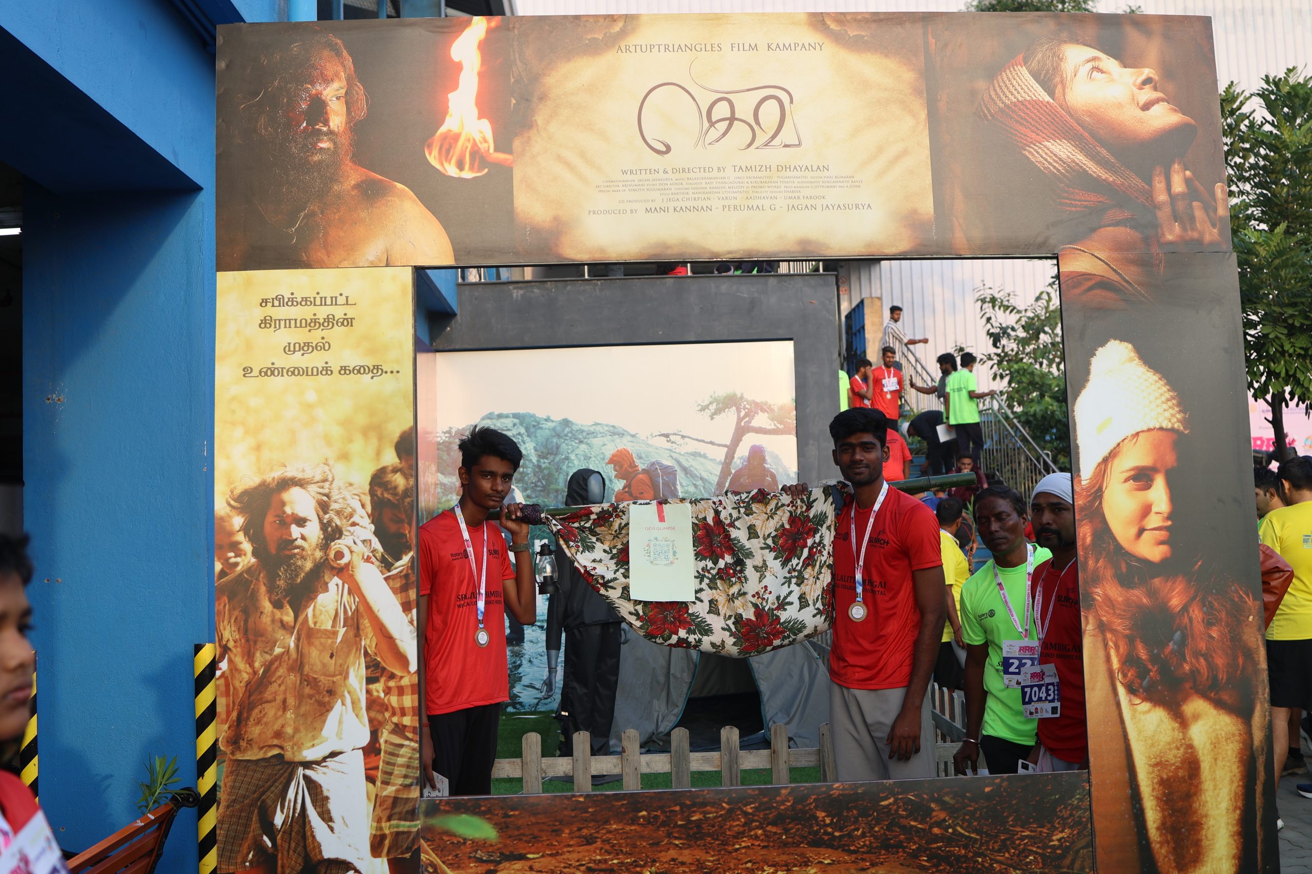 கெவி படக்குழுவினர் மலைக் கிராமத்து மக்கள் பயன்படுத்தும்‘டோலி’ என்கிற சாதனத்தை கைகளில் பிடித்தபடி இந்த மாரத்தான் நிகழ்வில் கலந்துகொண்டனர்.