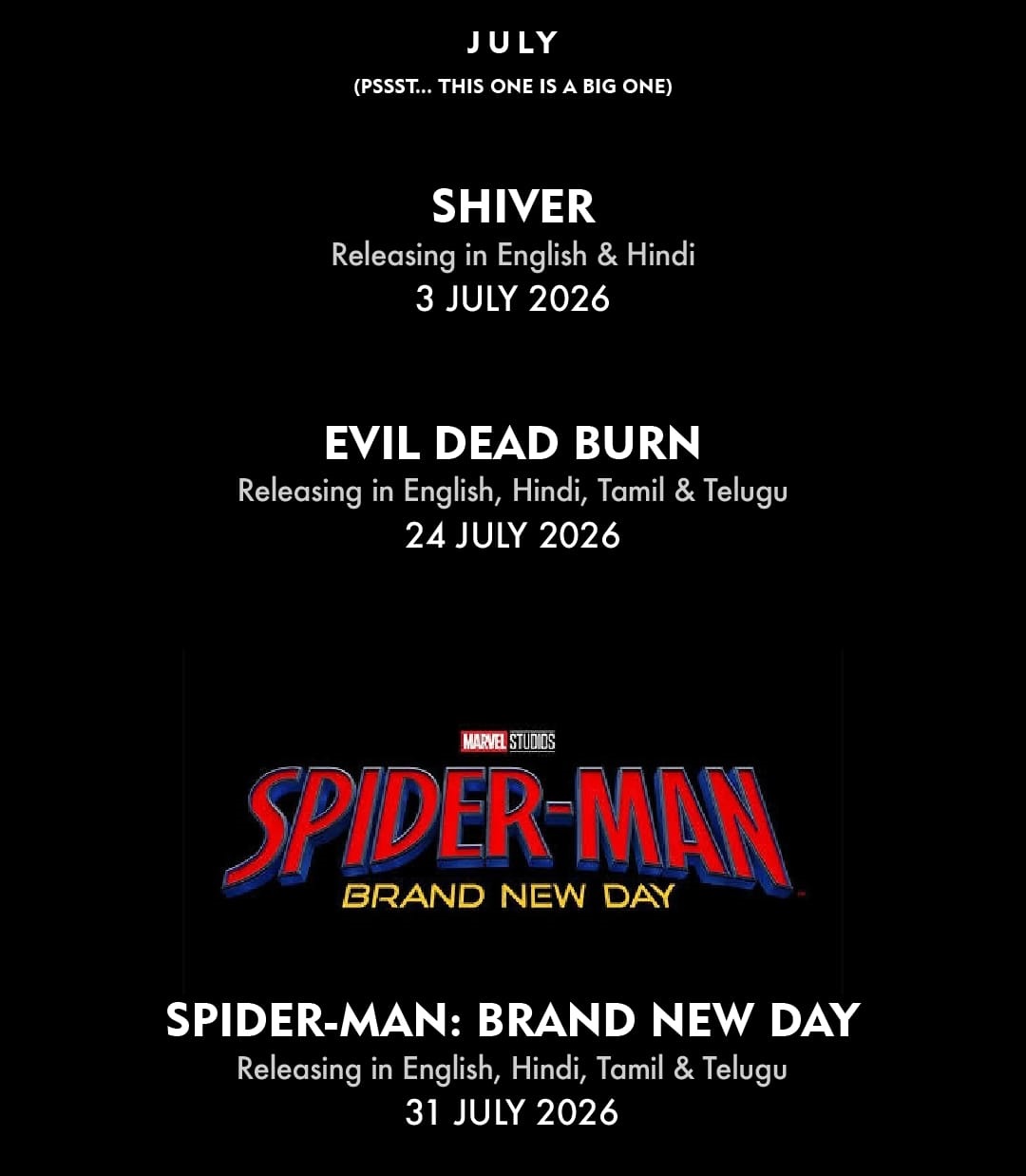 The back half of the year belongs to legacy IP. Spider-Man: Brand New Day releasing on July 31, 2026 swings into theatres with Tom Holland returning as cinema’s most beloved modern superhero — one who has never lost his popularity — alongside Zendaya under the direction of Destin Daniel Cretton. The film has intense hype as Tom Holland marks a fresh start to No-Way Home world where Peter Parker was forgotten and now facing new villains. At the same time, the surprise star cast which is yet to be revealed makes this title one of the most awaited movie this year. Spider-Man: No Way Home in 2022, delivered a historic box-office run in India, grossing close to Rs 300 cr, becoming one of the highest-grossing Hollywood releases in India. Fueled by nostalgia, multigenerational appeal, and exceptional word-of-mouth, the film reaffirmed Spider-Man’s unmatched theatrical pull in India.