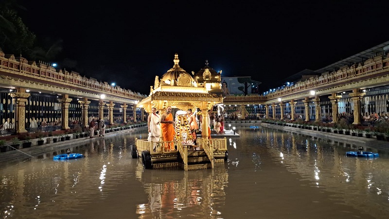 On the auspicious occasion of Sri Durga Ashtami, several sacred rituals were performed at Sri Mutt today. As part of the celebrations, the Sri Durga Teppotsava was held in a grand manner at Sri Parimala Teertha Pushkarini. H.H. Sri Swamiji visited the Sri Manchalamma Sandhana and proceeded to the Pushkarini, accompanied by the Sri Manchalamma Utsava Murthy. The Teppotsava was conducted with great devotion and splendor, followed by the Pallaki Utsava along Sri Madwamarga. A large number of devotees witnessed these divine events and received the blessings.