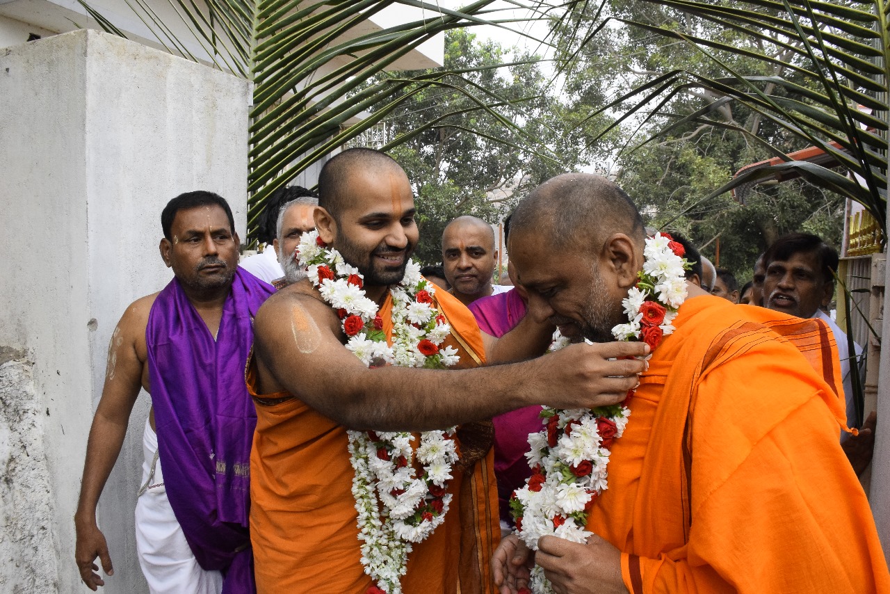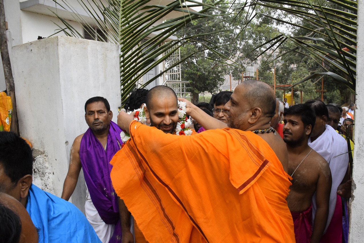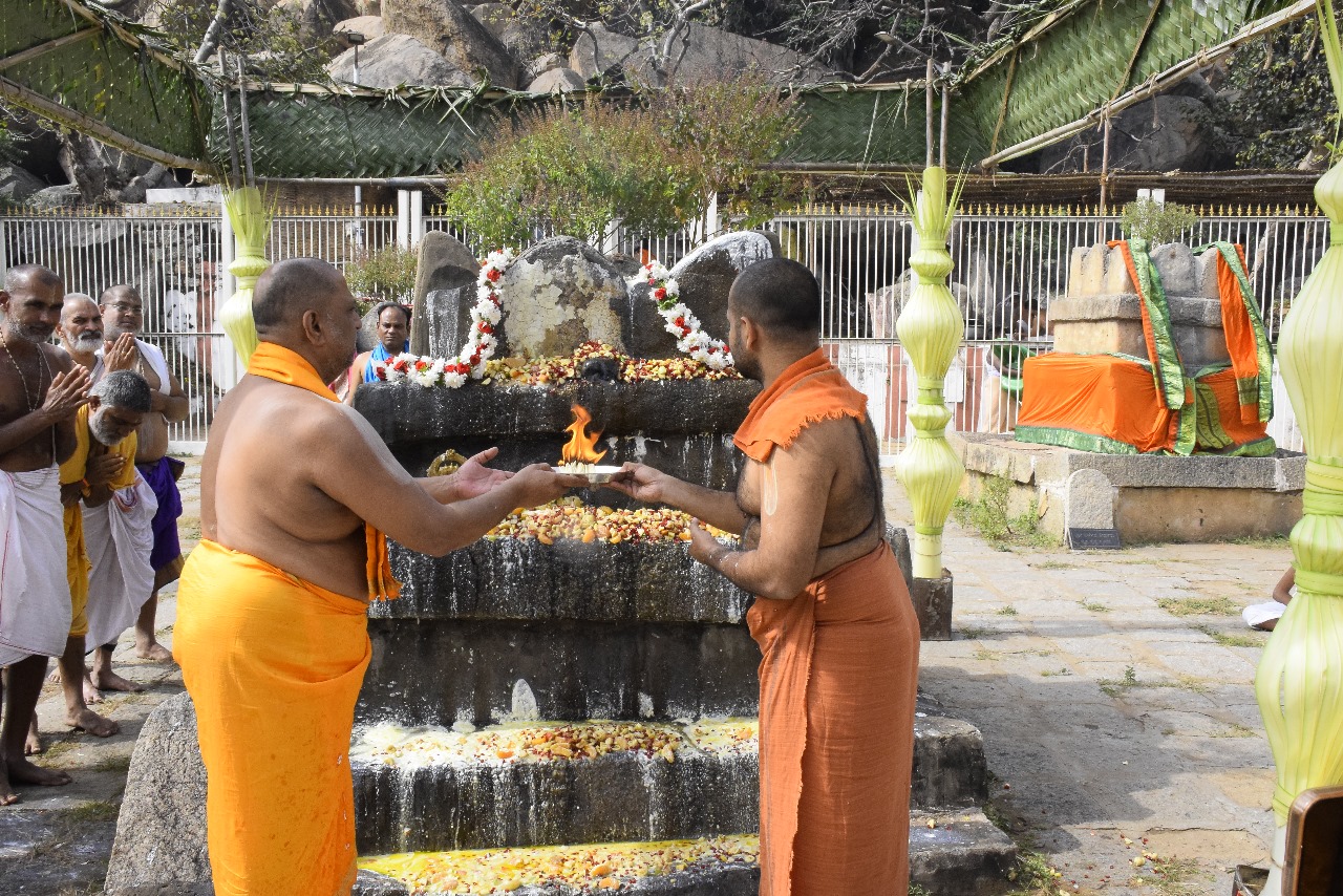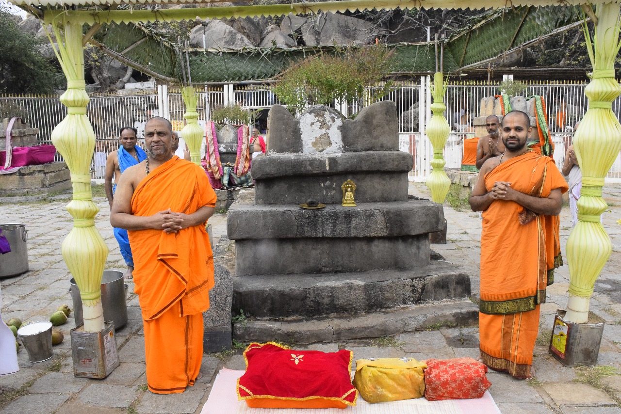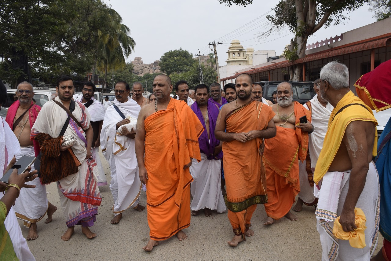 In the morning, H.H. Sri Vishwavallabha Teertha Swamiji, Peethadipati of Sri Sode Vadiraja Mutt, visited Anegundi Kshetra, where he was warmly welcomed by H.H. Sri Subudhendra Teertha Swamiji traditionally. Both revered Swamijis then proceeded to Navabrundavana Gadde in a majestic procession.