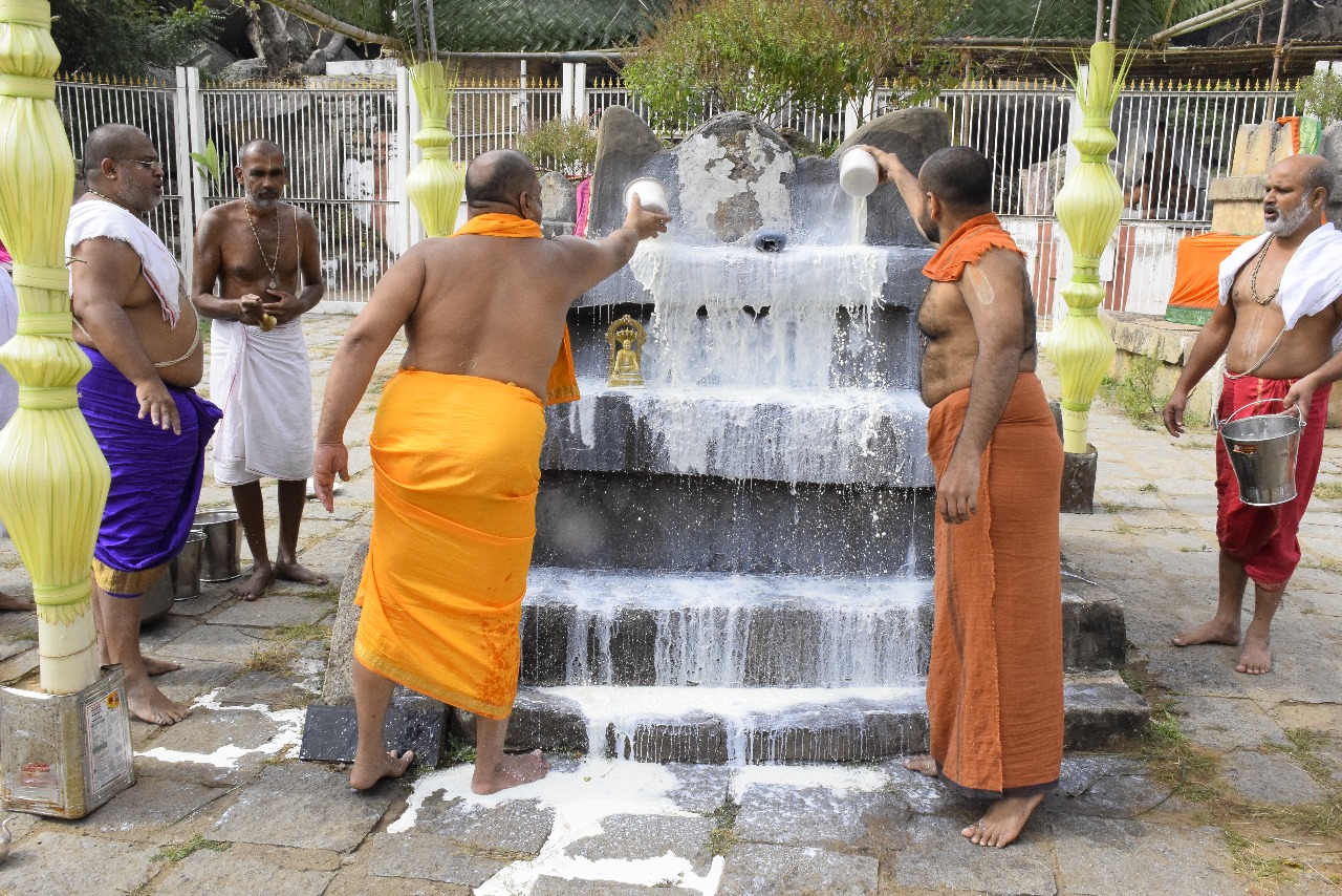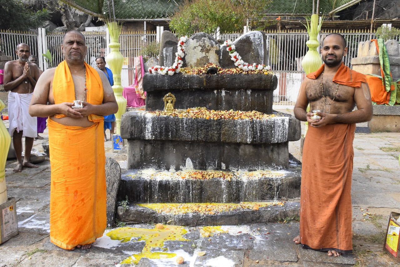 H.H. Sri Subudhendra Teertha Swamiji and H.H. Sri Vishwavallabha Teertha Swamiji jointly performed the Maha Panchamrutabhisheka to the Moola Brundavana of Sri Padmanabha Teertharu.