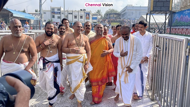 Earlier on his arrival, he was received with traditional Isthikaphal Honours (Pedda Maryada) amidst chanting of Veda Mantras at the sacred fig tree located near Old Annaprasadam Complex.