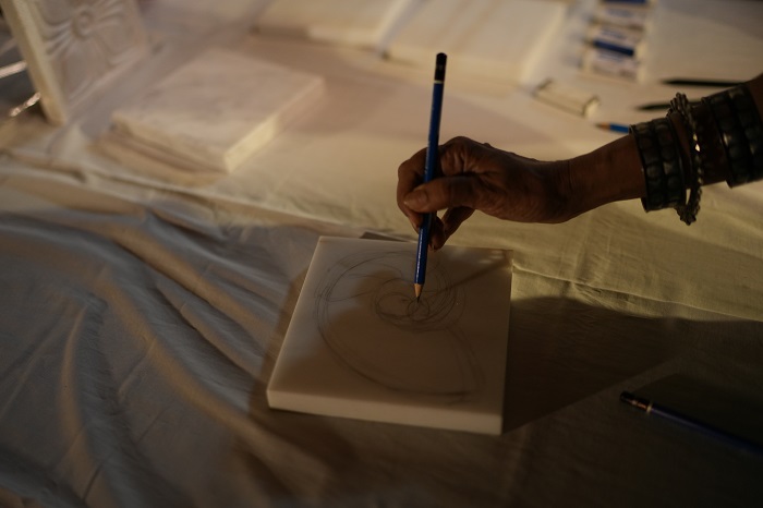 Adding to this multisensory canvas, the evening featured four traditional artisans from Mahabalipuram — S. Velliyan, A. Viswanathan, S. Suresh, and P. Saravanan — who engaged audiences in chiseling intricate drawings onto marble slabs sourced from diverse provenances. This interactive element bridged centuries of craftsmanship with contemporary storytelling, giving guests the rare opportunity to work with stone in its most authentic form.