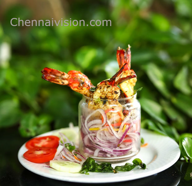 An inimitable thirst quencher, a chilled glass of Nannari Sharbat (sarsaparilla syrup) and a cold glass of Jigarthanda with layers of vermicelli, basil seeds and nuts; begin the dining experience, followed by aromatic crab soup, spiced with ground pepper.