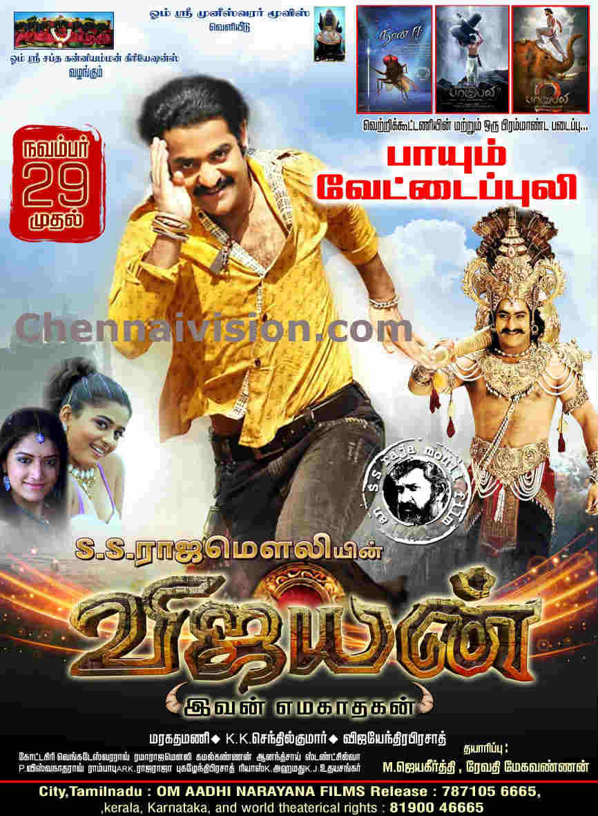 Director S.S. Rajamouli had directed 11 films in which 5 films were remake, 2 films were dubbed, 3 films in all Indian Languages released at the same time. Now the Yamodonga (Vijaiyan) film is releasing in Tamil dubbing. The Tamil version of Yamadonga (Vijaiyan) film is produced by Shri. Saptha Kanni Amman Creations M.Jeya keerthi and Revathy Mega Vannan and will released by Shri. Muneeswara Movies. The Yamodonga (Vijaiyan) Tamil movie will be released on November 29 World Wide.