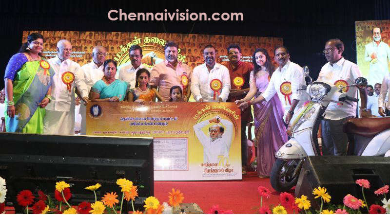 சிறப்பு விருந்தினர்களின் முன்னிலையில் நலத்திட்ட உதவிகள் வழங்கப்பட்டது . மேலும் சிறப்பு அழைப்பாளர்கள் அனைவருக்கும் சிறப்பு பரிசுகள் தென் சென்னை மேற்கு மாவட்ட ரஜினி மக்கள் மன்றத்தின் சார்பில் வழங்கப்பட்டது .