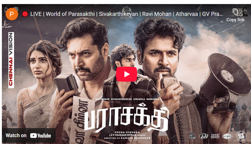 The Live link for the event “Revealing the World of Parasakthi”. By Chennaivision in Cinema News, News, சினிமா செய்திகள் December 19, 2025https://www.youtube.com/live/eadTQbjsXvw?si=L7NrlP99-pHiRrqzShare this: Click to share on X (Opens in new window) X Click to share on Facebook (Opens in new window) Facebook Like this:Like Loading...Related