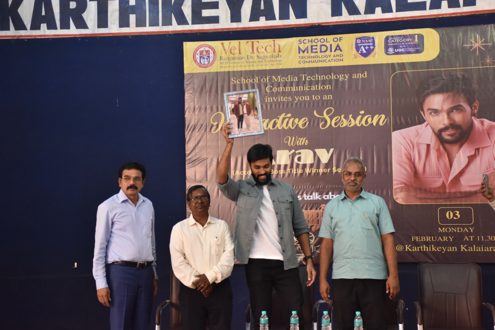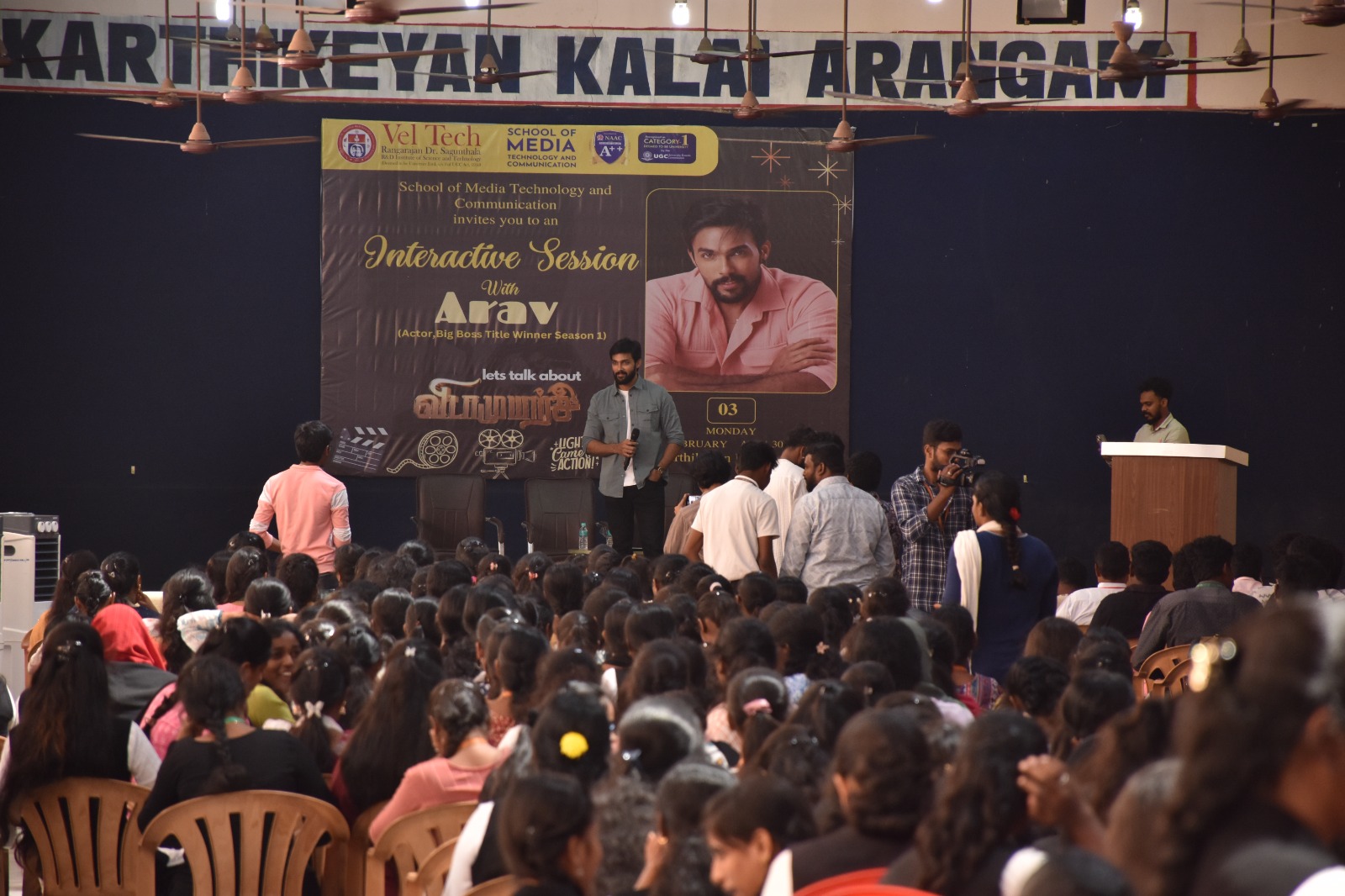 The Event was organized by School of media technology and communication Dept. and this Interactive session included more than 2000 students with actor Aarav answering about his contemporary film career and his personal life, subsequently he propagated about his upcoming movie “vidamuyarchi with actor Ajith kumar, mentioning that “this film will be loved by the audience, and the movie will deliver an impactful social message for the audience.