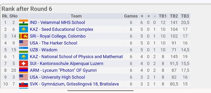 மொத்தம் எட்டு சுற்று. தொடர்ச்சியாக நான்கு சுற்றில் முறையே மங்கோலியா, ஹங்கேரி,ஆஸ்திரியா, அமெரிக்க, கஜகிஸ்தான், இலங்கை நாட்டுப் பள்ளியை எதிர்கொண்டு வெற்றி பெற்றனர். நாளை நடைபெறும் எழாவது சுற்றில் தரவரிசையில் முதலிடமான கஜகிஸ்தான் நாட்டின் சீட் (seed educational Complex) எஜிகேசனல் காம்ப்ளக்ஸ் பள்ளியை சந்திக்கின்றனர்.